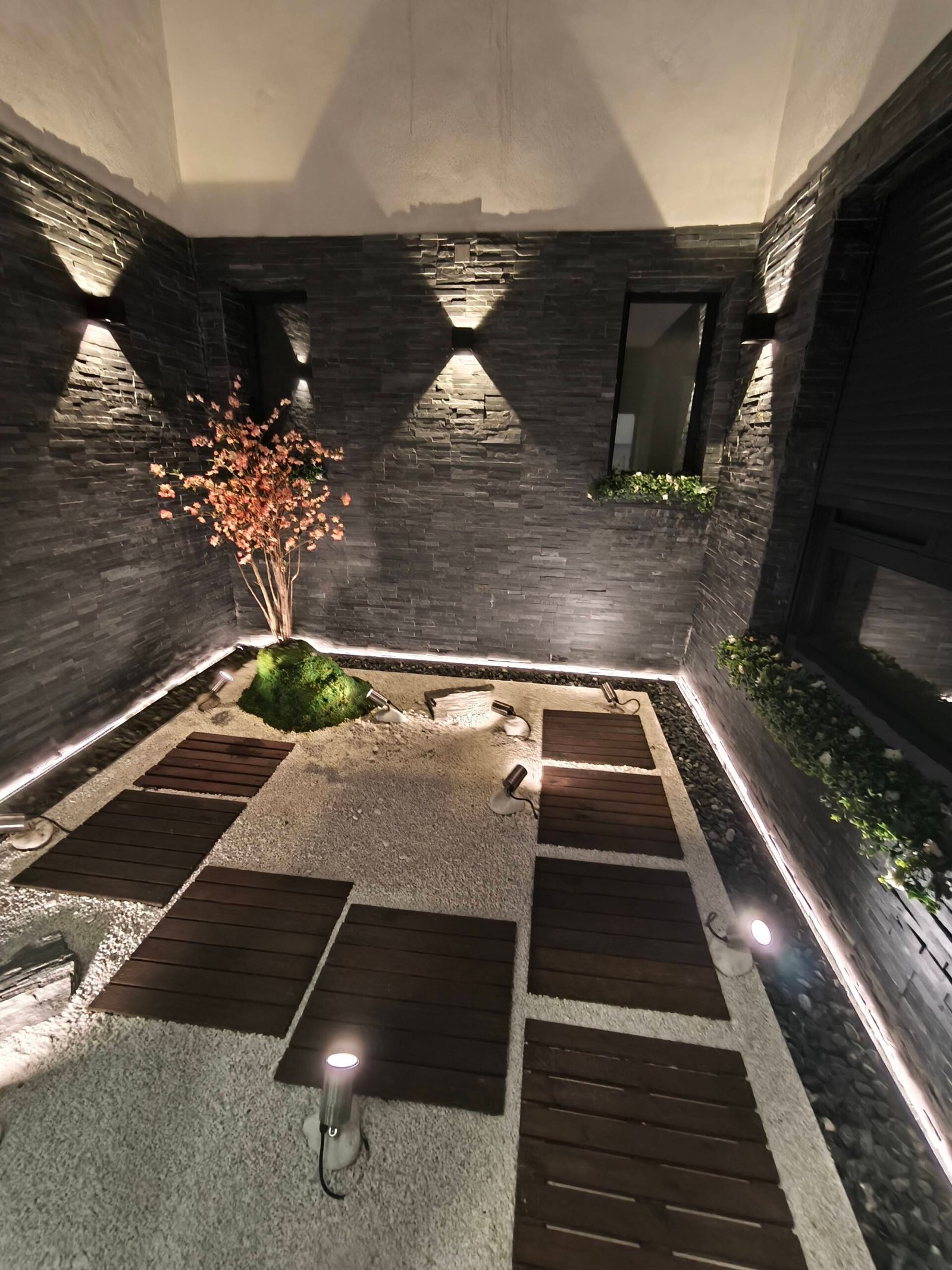 La iluminación juega un papel fundamental en este jardín, especialmente considerando su uso en horario nocturno y las condiciones del patio de luces.