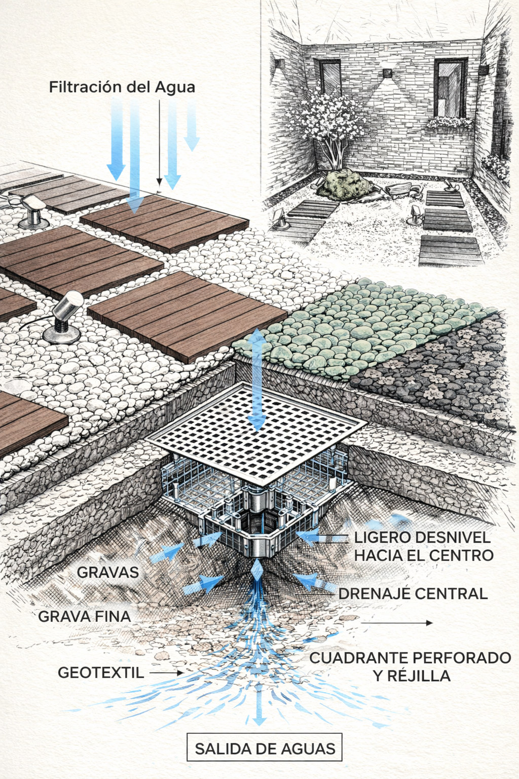 Esta capa permite evitar encharcamientos, un aspecto crítico en patios de luces donde la evacuación natural del agua puede ser limitada. Además, contribuye a la longevidad del conjunto al reducir tensiones estructurales derivadas de la humedad.